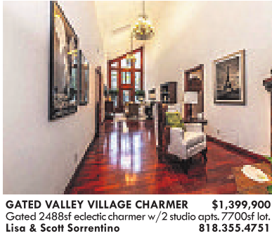 GATED VALLEY VILLAGE CHARMER $1,399,900 Gated 2488sf eclectic charmer w/2 studio apts.7700sf lot. Lisa &Scott Sorrentino 818.355.4751