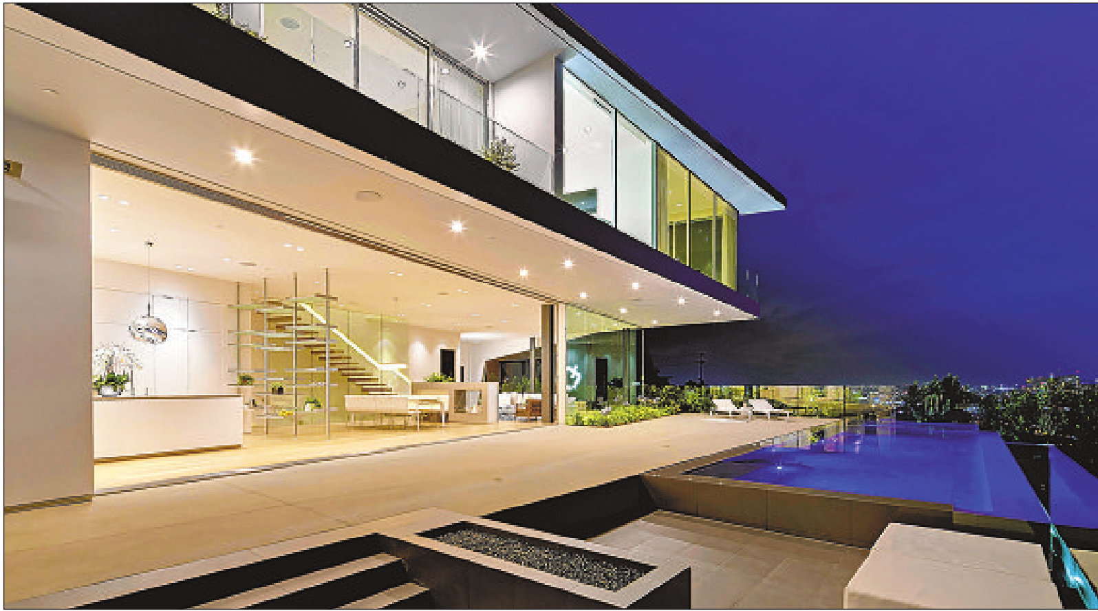 The striking home, designed by Belzberg Architects, features streamlined living spaces, walls of floor-to-ceiling glass and views extending from city to ocean.