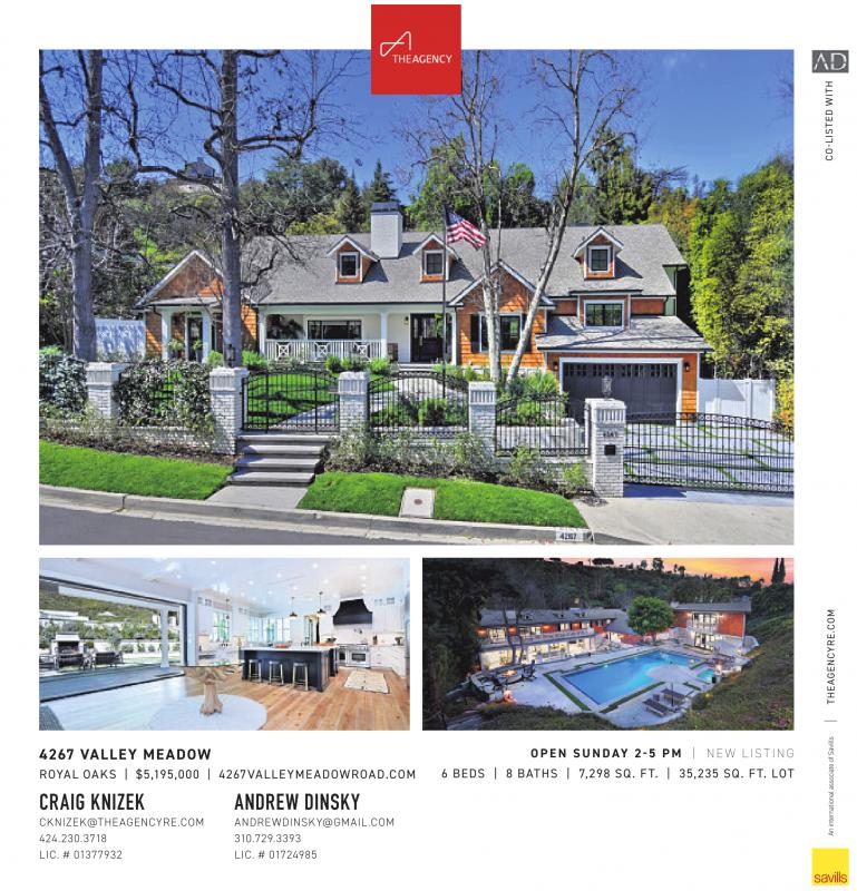 4267 VALLEY MEADOW OPEN SUNDAY 2-5 PM | NEW LISTING ROYAL OAKS | $5,195,000 | 4267VALLEYMEADOWROAD.COM 6 BEDS | 8 BATHS | 7,298 SQ. FT. | 35,235 SQ. FT. LOT CRAIG KNIZEK ANDREW DINSKY CKNIZEK@THEAGENCYRE.COM ANDREWDINSKY@GMAIL.COM 424.230.3718 310.729.3393 LIC. # 01377932 LIC. # 01724985