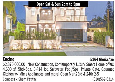 Open Sat &Sun 2pm to 5pm Encino 5164 Gloria Ave $2,875,000.00 New Construction, Contemporary Luxury Smart Home offers 4,600 sf, 5bd/6ba, 8,414 lot, Saltwater Pool/Spa, Private Gate, Gourmet Kitchen w/ Miele Appliances and more! OpenMar 23rd&24th 2-5 Compass /Sheryl Petway (310)569-8314