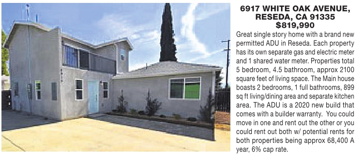6917 WHITE OAK AVENUE, RESEDA, CA 91335 $819,990 Great single story home with abrand new permitted ADU in Reseda. Each property has its own separate gas and electric meter and 1shared water meter. Properties total 5 bedroom, 4.5 bathroom, approx 2100 square feet of living space. The Main house boasts 2bedrooms, 1full bathrooms, 899 sq ft living/dining area and separate kitchen area. The ADU is a 2020 new build that comes with abuilder warranty. You could move in one and rent out the other or you could rent out both w/ potential rents for both properties being approx 68,400 A year, 6%cap rate.