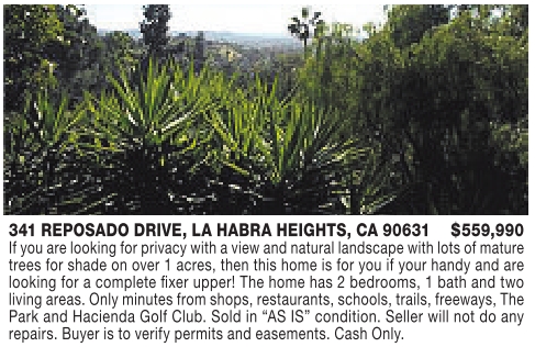 repairs. Buyer istoverify permits and easements. Cash Only. 341 REPOSADO DRIVE, LA HABRA HEIGHTS, CA 90631 $559,990 If you are looking for privacy with aview and natural landscape with lots of mature trees for shade on over 1 acres, then this home is for you if your handy and are looking for a complete fixer upper! The home has 2 bedrooms, 1 bath and two living areas. Only minutes from shops, restaurants, schools, trails, freeways, The Park and Hacienda Golf Club. Sold in “AS IS” condition. Seller will not do any