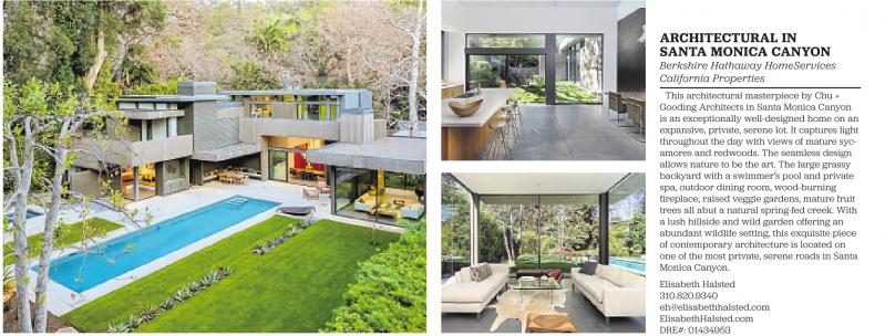 This architectural masterpiece by Chu + Gooding Architects in Santa Monica Canyon is an exceptionally well-designed home on an expansive, private, serene lot. It captures light throughout the day with views of mature sycamores and redwoods. The seamless design allows nature to be the art. The large grassy backyard with a swimmer’s pool and private spa, outdoor dining room, wood-burning fireplace, raised veggie gardens, mature fruit trees all abut a natural spring-fed creek. With a lush hillside and wild garden offering an abundant wildlife setting, this exquisite piece of contemporary architecture is located on one of the most private, serene roads in Santa Monica Canyon.