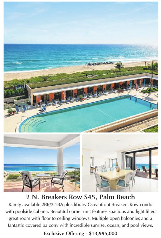 2 N. Breakers Row S45, Palm Beach Rarely available 2BR/2.1BA plus library Oceanfront Breakers Row condo with poolside cabana. Beautiful corner unit features spacious and light filled great room with floor to ceiling windows. Multiple open balconies and a fantastic covered balcony with incredible sunrise, ocean, and pool views. Exclusive Offering - $13,995,000