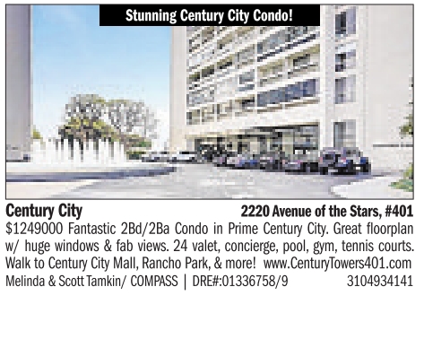 Century City 2220 Avenue of the Stars, #401 $1249000 Fantastic 2Bd/2Ba Condo in Prime Century City. Great floorplan w/ huge windows & fab views. 24 valet, concierge, pool, gym, tennis courts. Walk to Century City Mall, Rancho Park, & more! www.CenturyTowers401.com Melinda & Scott Tamkin/ COMPASS | DRE#:01336758/9 3104934141