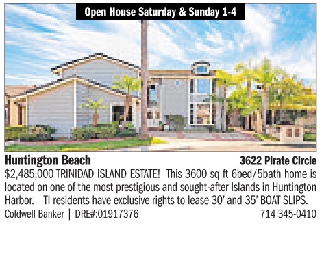 Open House Saturday & Sunday 1-4 Huntington Beach 3622 Pirate Circle $2,485,000 TRINIDAD ISLAND ESTATE! This 3600 sq ft 6bed/5bath home is located on one of the most prestigious and sought-after Islands in Huntington Harbor. TI residents have exclusive rights to lease 30’ and 35’ BOAT SLIPS. Coldwell Banker | DRE#:01917376 714 345-0410