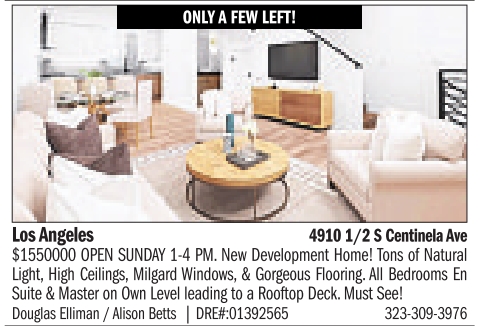 Los Angeles 4910 1/2 S Centinela Ave $1550000 OPEN SUNDAY 1-4 PM. New Development Home! Tons of Natural Light, High Ceilings, Milgard Windows, & Gorgeous Flooring. All Bedrooms En Suite & Master on Own Level leading to a Rooftop Deck. Must See! Douglas Elliman / Alison Betts | DRE#:01392565 323-309-3976