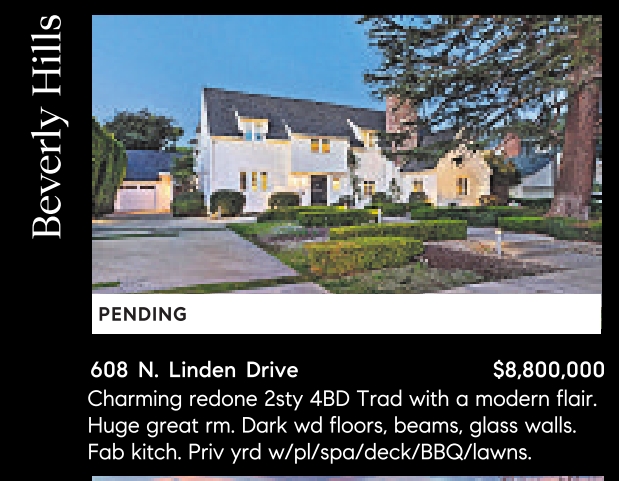 608 N. Linden Drive $8,800,000 Charming redone 2sty 4BD Trad with a modern flair. Huge great rm. Dark wd floors, beams, glass walls. Fab kitch. Priv yrd w/pl/spa/deck/BBQ/lawns.