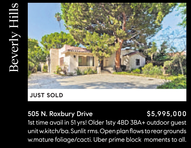 505 N. Roxbury Drive $5,995,000 1st time avail in 51 yrs! Older 1sty 4BD 3BA+ outdoor guest unitw.kitch/ba. Sunlit rms. Openplanflowstoreargrounds w.mature foliage/cacti. Uber prime block moments to all.