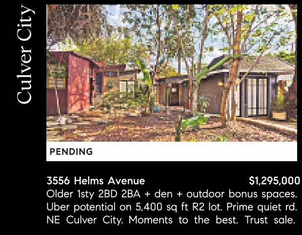 3556 Helms Avenue $1,295,000 Older 1sty 2BD 2BA + den + outdoor bonus spaces. Uber potential on 5,400 sq ft R2 lot. Prime quiet rd. NE Culver City. Moments to the best. Trust sale.