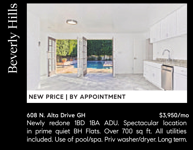 608 N. Alta Drive GH $3,950/mo Newly redone 1BD 1BA ADU. Spectacular location in prime quiet BH Flats. Over 700 sq ft. All utilities included. Use of pool/spa. Priv washer/dryer. Long term.