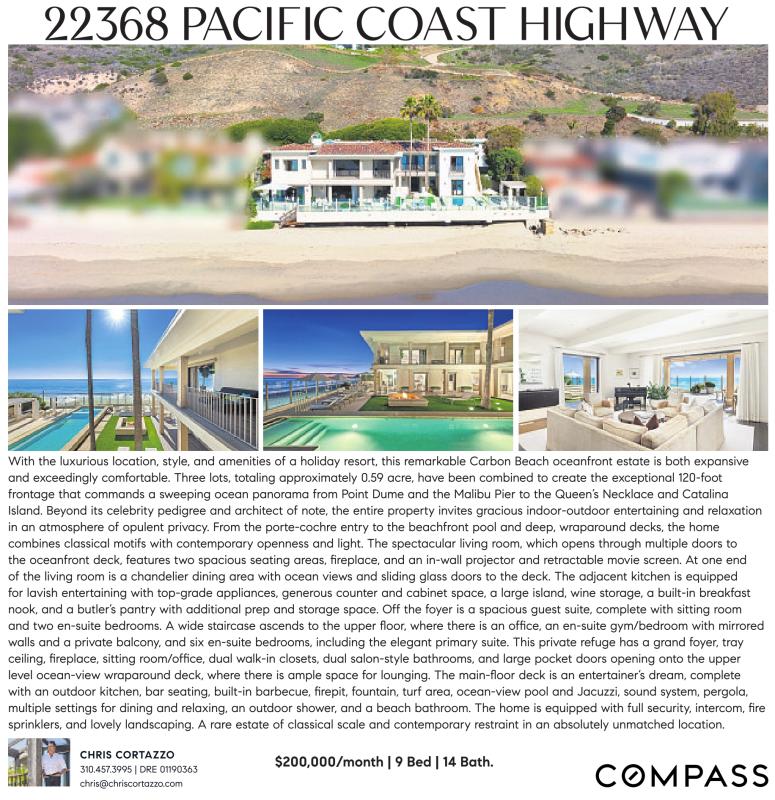 With the luxurious location, style, and amenities of a holiday resort, this remarkable Carbon Beach oceanfront estate is both expansive and exceedingly comfortable. Three lots, totaling approximately 0.59 acre, have been combined to create the exceptional 120-foot frontage that commands a sweeping ocean panorama from Point Dume and the Malibu Pier to the Queen’s Necklace and Catalina Island. Beyond its celebrity pedigree and architect of note, the entire property invites gracious indoor-outdoor entertaining and relaxation in an atmosphere of opulent privacy. From the porte-cochre entry to the beachfront pool and deep, wraparound decks, the home combines classical motifs with contemporary openness and light. The spectacular living room, which opens through multiple doors to the oceanfront deck, features two spacious seating areas, fireplace, and an in-wall projector and retractable movie screen. At one end of the living room is a chandelier dining area with ocean views and sliding glass doors to the deck. The adjacent kitchen is equipped for lavish entertaining with top-grade appliances, generous counter and cabinet space, a large island, wine storage, a built-in breakfast nook, and a butler’s pantry with additional prep and storage space. Off the foyer is a spacious guest suite, complete with sitting room and two en-suite bedrooms. A wide staircase ascends to the upper floor, where there is an office, an en-suite gym/bedroom with mirrored walls and a private balcony, and six en-suite bedrooms, including the elegant primary suite. This private refuge has a grand foyer, tray ceiling, fireplace, sitting room/office, dual walk-in closets, dual salon-style bathrooms, and large pocket doors opening onto the upper level ocean-view wraparound deck, where there is ample space for lounging. The main-floor deck is an entertainer’s dream, complete with an outdoor kitchen, bar seating, built-in barbecue, firepit, fountain, turf area, ocean-view pool and Jacuzzi, sound system, pergola, multiple settings for dining and relaxing, an outdoor shower, and a beach bathroom. The home is equipped with full security, intercom, fire sprinklers, and lovely landscaping. A rare estate of classical scale and contemporary restraint in an absolutely unmatched location.