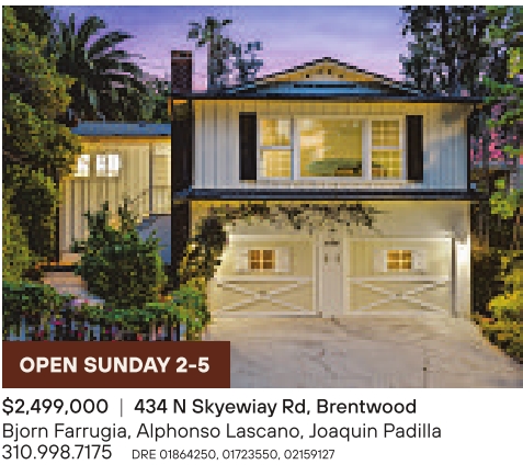 OPEN SUNDAY 2-5 $2,499,000 | 434 N Skyewiay Rd, Brentwood Bjorn Farrugia, Alphonso Lascano, Joaquin Padilla 310.998.7175 DRE 01864250, 01723550, 02159127 See also