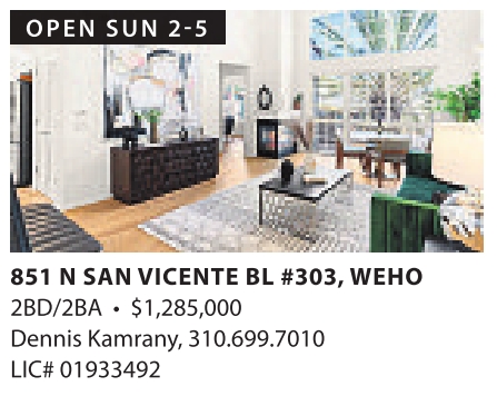 OPEN SUN 2-5 851 N SAN VICENTE BL #303, WEHO 2BD/2BA • $1,285,000 Dennis Kamrany, 310.699.7010 LIC# 01933492 See also