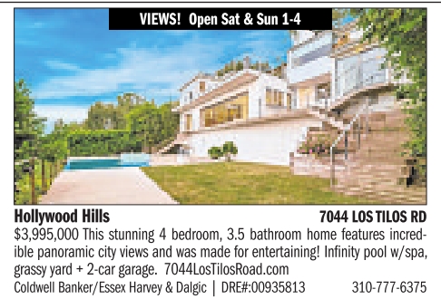 VIEWS! Open Sat & Sun 1-4 Hollywood Hills 7044 LOSTILOS RD $3,995,000 This stunning 4 bedroom, 3.5 bathroom home features incredible panoramic city views and was made for entertaining! Infinity pool w/spa, grassy yard + 2-car garage. 7044LosTilosRoad.com Coldwell Banker/Essex Harvey & Dalgic | DRE#:00935813 310-777-6375