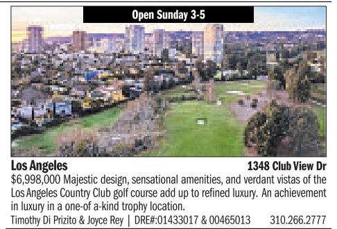 Open Sunday 3-5 Los Angeles 1348 ClubView Dr $6,998,000 Majestic design, sensational amenities, and verdant vistas of the LosAngeles Country Club golf course add up to refined luxury. An achievement in luxury in a one-of a-kind trophy location. Timothy Di Prizito & Joyce Rey | DRE#:01433017 & 00465013 310.266.2777 See also