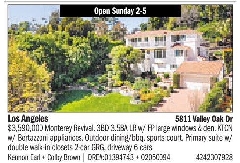 Open Sunday 2-5 Los Angeles 5811Valley Oak Dr $3,590,000 Monterey Revival.3BD 3.5BA LR w/ FP large windows & den.KTCN w/ Bertazzoni appliances. Outdoor dining/bbq, sports court. Primary suite w/ double walk-in closets 2-car GRG, driveway 6 cars Kennon Earl + Colby Brown | DRE#:01394743 + 02050094 4242307928 See also