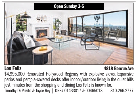 Open Sunday 3-5 Los Feliz 4818 BonvueAve $4,995,000 Renovated Hollywood Regency with explosive views. Expansive patios and pergola-covered decks offer indoor/outdoor living in the quiet hills just minutes from the shopping and dining Los Feliz is known for. Timothy Di Prizito & Joyce Rey | DRE#:01433017 & 00465013 310.266.2777 See also