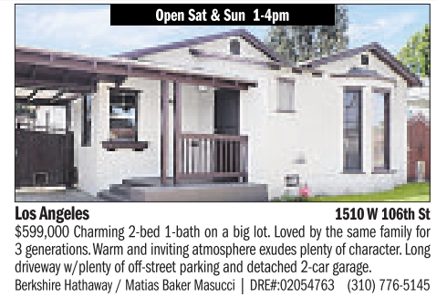 Open Sat & Sun 1-4pm Los Angeles 1510W 106th St $599,000 Charming 2-bed 1-bath on a big lot. Loved by the same family for 3 generations.Warm and inviting atmosphere exudes plenty of character. Long driveway w/plenty of off-street parking and detached 2-car garage. Berkshire Hathaway / Matias Baker Masucci | DRE#:02054763 (310) 776-5145