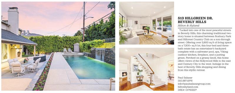 Tucked into one of the most peaceful streets in Beverly Hills, this charming traditional twostory home is situated between Roxbury Park and Hillcrest Country Club on a non-through street. Offering over 2,800 sq ft of living space on a 7,300+ sq ft lot, this four-bed and threebath estate has an entertainer’s backyard complete with a saltwater pool, spa, Viking outdoor kitchen, fireplace, and a putting green. Perched on a grassy knoll, this home offers views of the Hollywood Hills to the east and Century City to the west. Indulge in the best of Beverly Hills shopping and dining from this idyllic retreat.