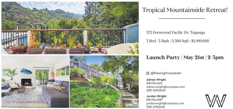 Tropical Mountainside Retreat! 575 Fernwood Pacific Dr, Topanga 3 Bed | 3 Bath | 2,300 Sqft | $1,999,000 Launch Party | May 21st | 2-5pm @thewrightwayteam Adrian Wright 818.939.6415 adrian.wright@compass.com DRE 00935559 Jordan Wright 818.746.6987 jordanwright@compass.com DRE 01952694