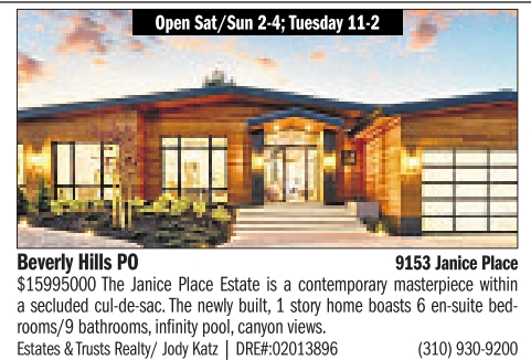 Open Sat/Sun 2-4; Tuesday 11-2 Beverly Hills PO 9153 Janice Place $15995000 The Janice Place Estate is a contemporary masterpiece within a secluded cul-de-sac. The newly built, 1 story home boasts 6 en-suite bedrooms/9 bathrooms, infinity pool, canyon views. Estates & Trusts Realty/ Jody Katz | DRE#:02013896 (310) 930-9200