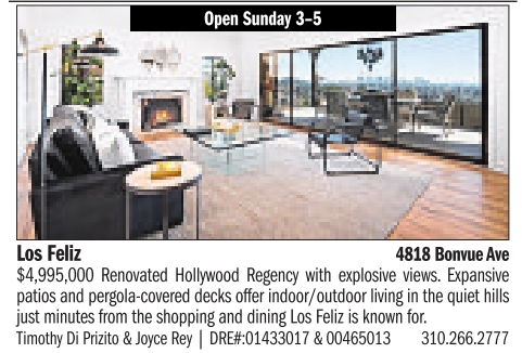 Open Sunday 3–5 Los Feliz 4818 BonvueAve $4,995,000 Renovated Hollywood Regency with explosive views. Expansive patios and pergola-covered decks offer indoor/outdoor living in the quiet hills just minutes from the shopping and dining Los Feliz is known for. Timothy Di Prizito & Joyce Rey | DRE#:01433017 & 00465013 310.266.2777 See also