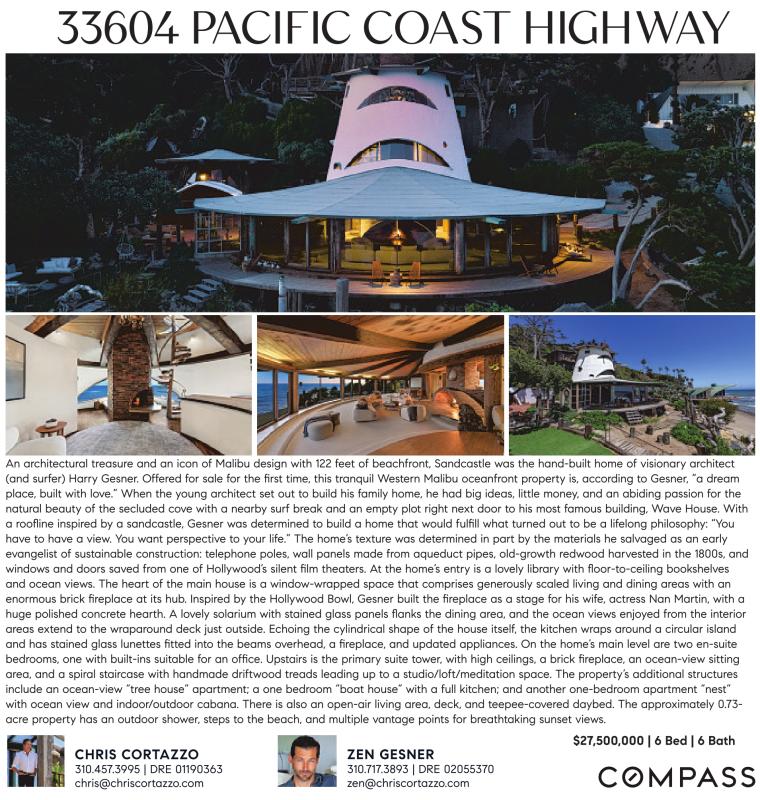 An architectural treasure and an icon of Malibu design with 122 feet of beachfront, Sandcastle was the hand-built home of visionary architect (and surfer) Harry Gesner. Offered for sale for the first time, this tranquil Western Malibu oceanfront property is, according to Gesner, “a dream place, built with love.” When the young architect set out to build his family home, he had big ideas, little money, and an abiding passion for the natural beauty of the secluded cove with a nearby surf break and an empty plot right next door to his most famous building, Wave House. With a roofline inspired by a sandcastle, Gesner was determined to build a home that would fulfill what turned out to be a lifelong philosophy: “You have to have a view. You want perspective to your life.” The home’s texture was determined in part by the materials he salvaged as an early evangelist of sustainable construction: telephone poles, wall panels made from aqueduct pipes, old-growth redwood harvested in the 1800s, and windows and doors saved from one of Hollywood’s silent film theaters. At the home’s entry is a lovely library with floor-to-ceiling bookshelves and ocean views. The heart of the main house is a window-wrapped space that comprises generously scaled living and dining areas with an enormous brick fireplace at its hub. Inspired by the Hollywood Bowl, Gesner built the fireplace as a stage for his wife, actress Nan Martin, with a huge polished concrete hearth. A lovely solarium with stained glass panels flanks the dining area, and the ocean views enjoyed from the interior areas extend to the wraparound deck just outside. Echoing the cylindrical shape of the house itself, the kitchen wraps around a circular island and has stained glass lunettes fitted into the beams overhead, a fireplace, and updated appliances. On the home’s main level are two en-suite bedrooms, one with built-ins suitable for an office. Upstairs is the primary suite tower, with high ceilings, a brick fireplace, an ocean-view sitting area, and a spiral staircase with handmade driftwood treads leading up to a studio/loft/meditation space. The property’s additional structures include an ocean-view “tree house” apartment; a one bedroom “boat house” with a full kitchen; and another one-bedroom apartment “nest” with ocean view and indoor/outdoor cabana. There is also an open-air living area, deck, and teepee-covered daybed. The approximately 0.73- acre property has an outdoor shower, steps to the beach, and multiple vantage points for breathtaking sunset views.