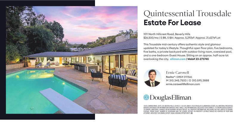 150 EL CAMINO DRIVE, SUITE 150, BEVERLY HILLS, CA 90212. 310.595.3888 © 2023 DOUGLAS ELLIMAN REAL ESTATE. ALL MATERIAL PRESENTED HEREIN IS INTENDED FOR INFORMATION PURPOSES ONLY. WHILE, THIS INFORMATION IS BELIEVED TO BE CORRECT, IT IS REPRESENTED SUBJECT TO ERRORS, OMISSIONS, CHANGES OR WITHDRAWAL WITHOUT NOTICE. ALL PROPERTY INFORMATION, INCLUDING, BUT NOT LIMITED TO SQUARE FOOTAGE, ROOM COUNT, NUMBER OF BEDROOMS AND THE SCHOOL DISTRICT IN PROPERTY LISTINGS SHOULD BE VERIFIED BY YOUR OWN ATTORNEY, ARCHITECT OR ZONING EXPERT. EQUAL HOUSING OPPORTUNITY.