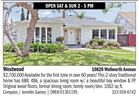 10820 Wellworth Avenue $2,700,000Available for the first time in over 60 years!This 2-storyTraditional home has 6BR, 4BA, a spacious living room w/ a beautiful bay window & FP. Original wood floors, formal dining room, family room/den. 3362 sq ft.
