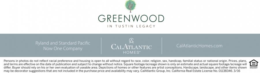 Persons in photos do not reflect racial preference and housing is open to all without regard to race, color, religion, sex, handicap, familial status or national origin. Prices, plans, and terms areeffectiveonthe dateofpublication and subject to changewithout notice. Square footage/acreage shownisonlyanestimateand actual squarefootage/acreage will differ.Buyer should rely on his or her ownevaluation of useable area.Depictions of homesorother features areartistconceptions.Hardscape,landscape,and other items shown maybedecorator suggestions that arenot included in thepurchasepriceand availability mayvary.CalAtlantic Group,Inc.California Real EstateLicenseNo. 01138346.3/16