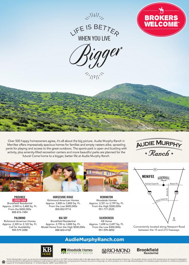 Over 500 happy homeowners agree, it’s all about the big picture. Audie Murphy Ranch in Menifee offers impressively spacious homes for families and empty nesters alike, sprawling yards for playing and access to the great outdoors. The sports park is open and bustling with activity, plus amenity-filled recreation centers and more beautiful parks are planned for the future! Come home to a bigger, better life at Audie Murphy Ranch.
